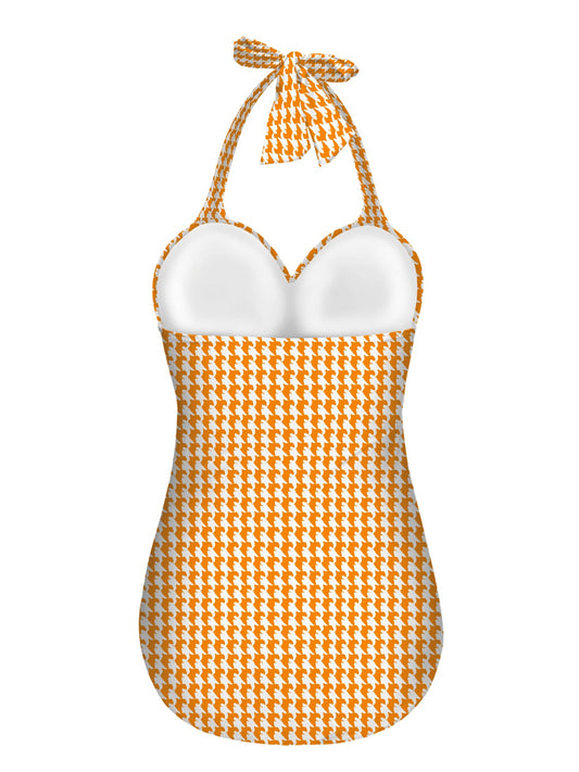 Vampire Art Vintage Chic Halter Neck One-Piece Swimsuit - Orange Houndstooth
