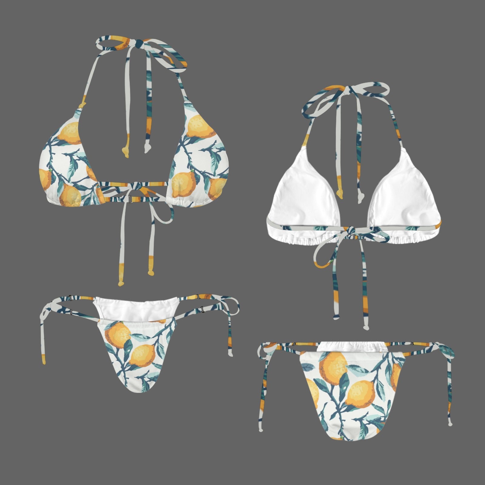 - Design: Adjustable halter and back ties, string thong bikini bottom with small ring metal accessories