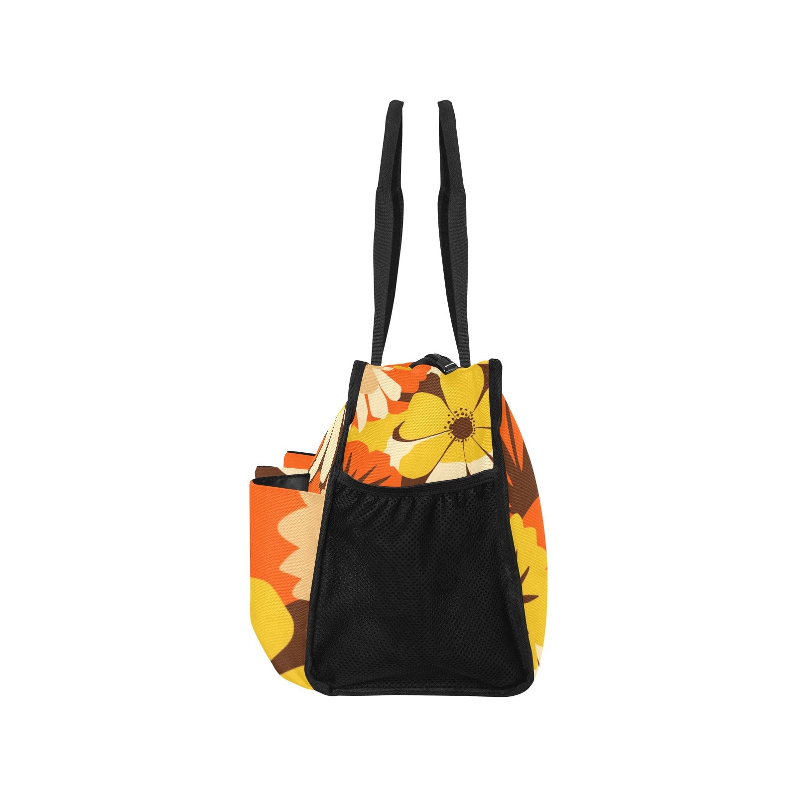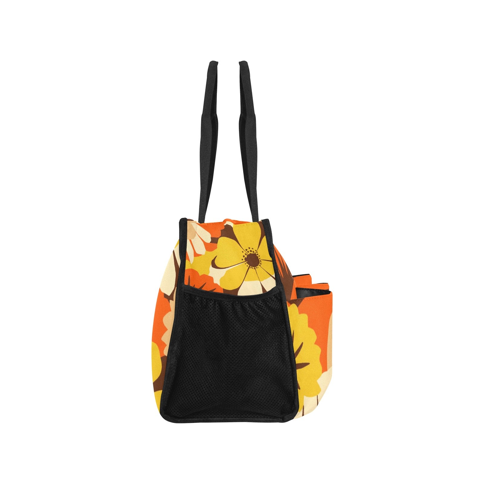 Vampire Art Retro Large Multi-pocket Beach Bag - Bold Sixties Floral in Yellow and Brown