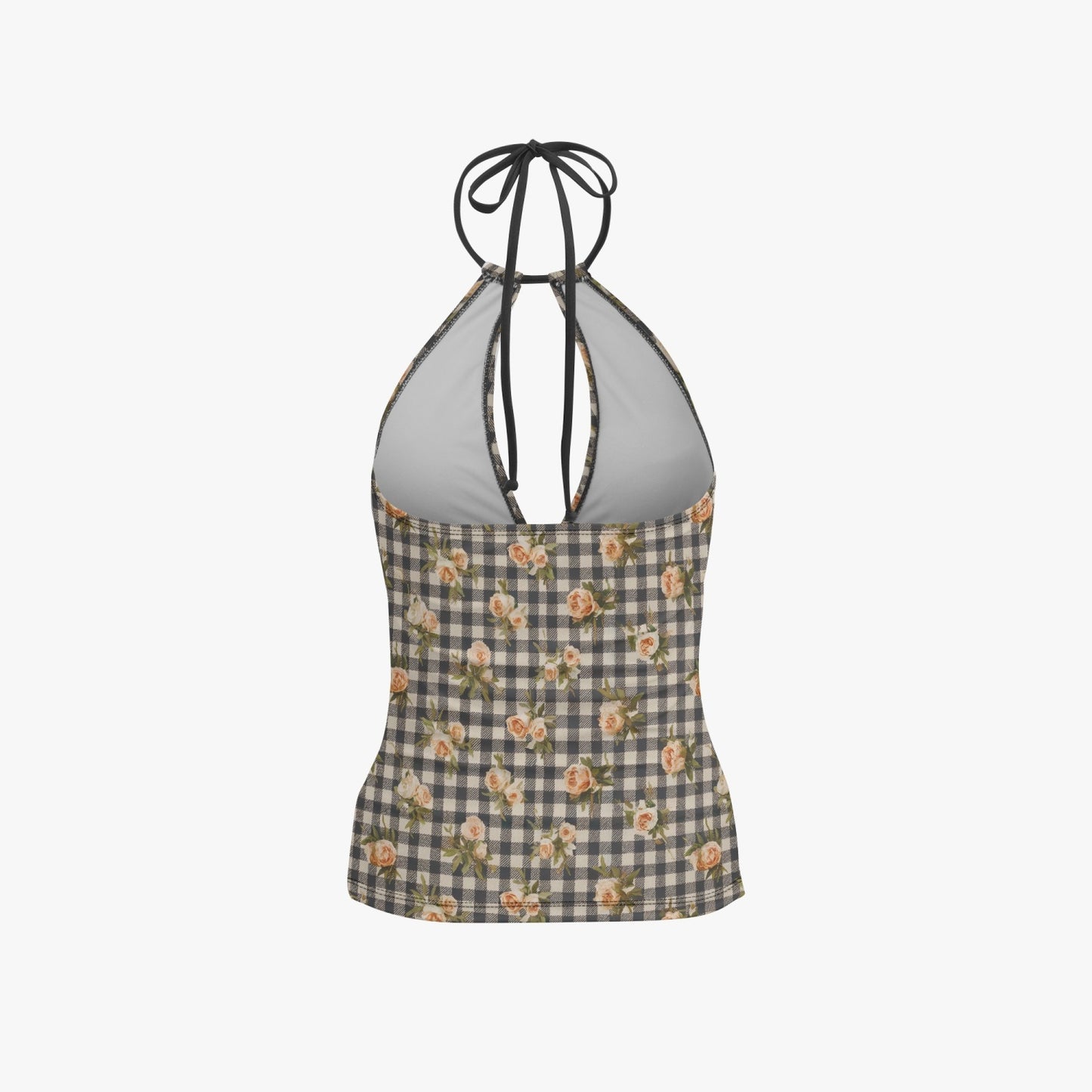 Vampire Art Retro Halter Two-Piece Tankini Swimsuit - Black Cottagecore Floral Gingham