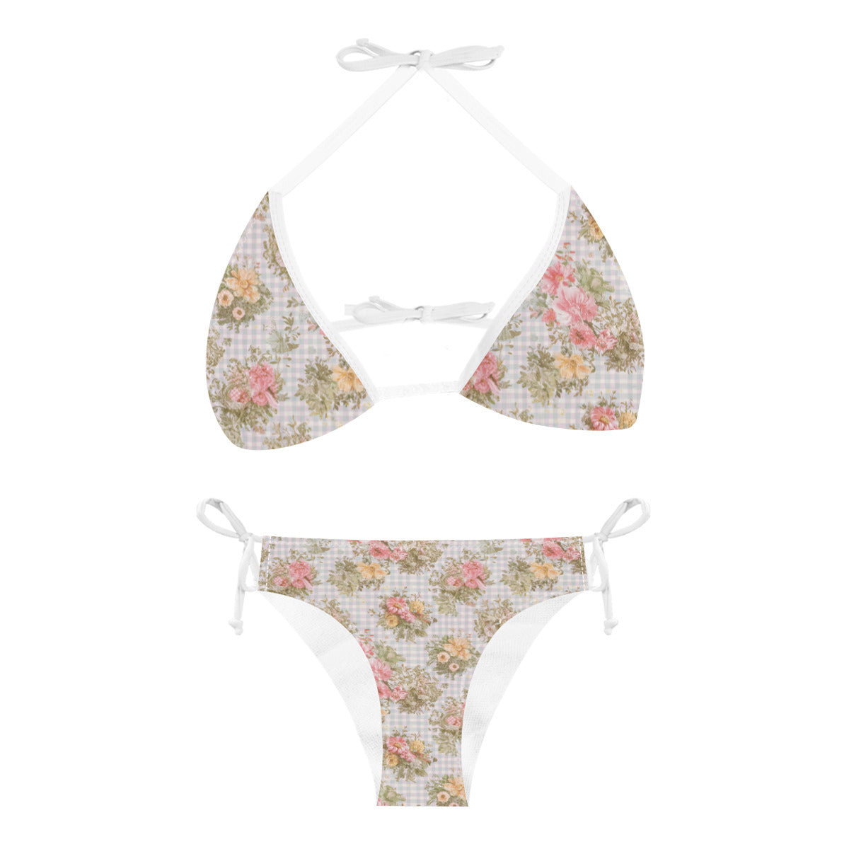 The "Vampire Art Gingham Blossom Cottagecore Bikini Set" is adorned with the cutest traditional gingham patterns, enhanced by an elegant floral touch that evokes enchanting cottagecore and shabby chic atmospheres. The delicate combination of these patterns creates a visually appealing and stylish look that is both modern and nostalgic. The halter triangle top features adjustable neck and back ties, while the bottoms have adjustable waist ties on both sides, allowing for a customizable and secure fit.