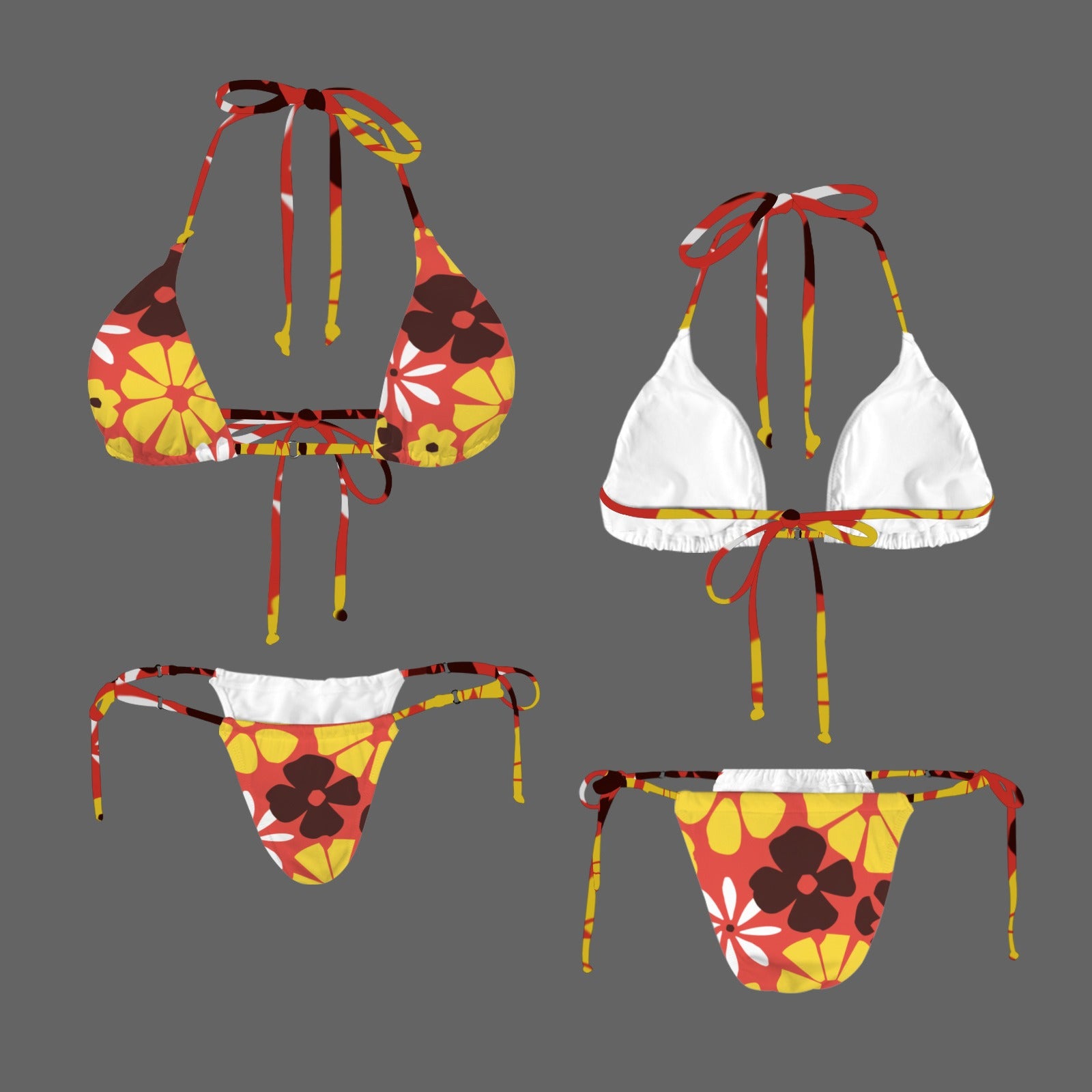 • Design: Adjustable halter and back ties, string thong bikini bottom with small ring metal accessories