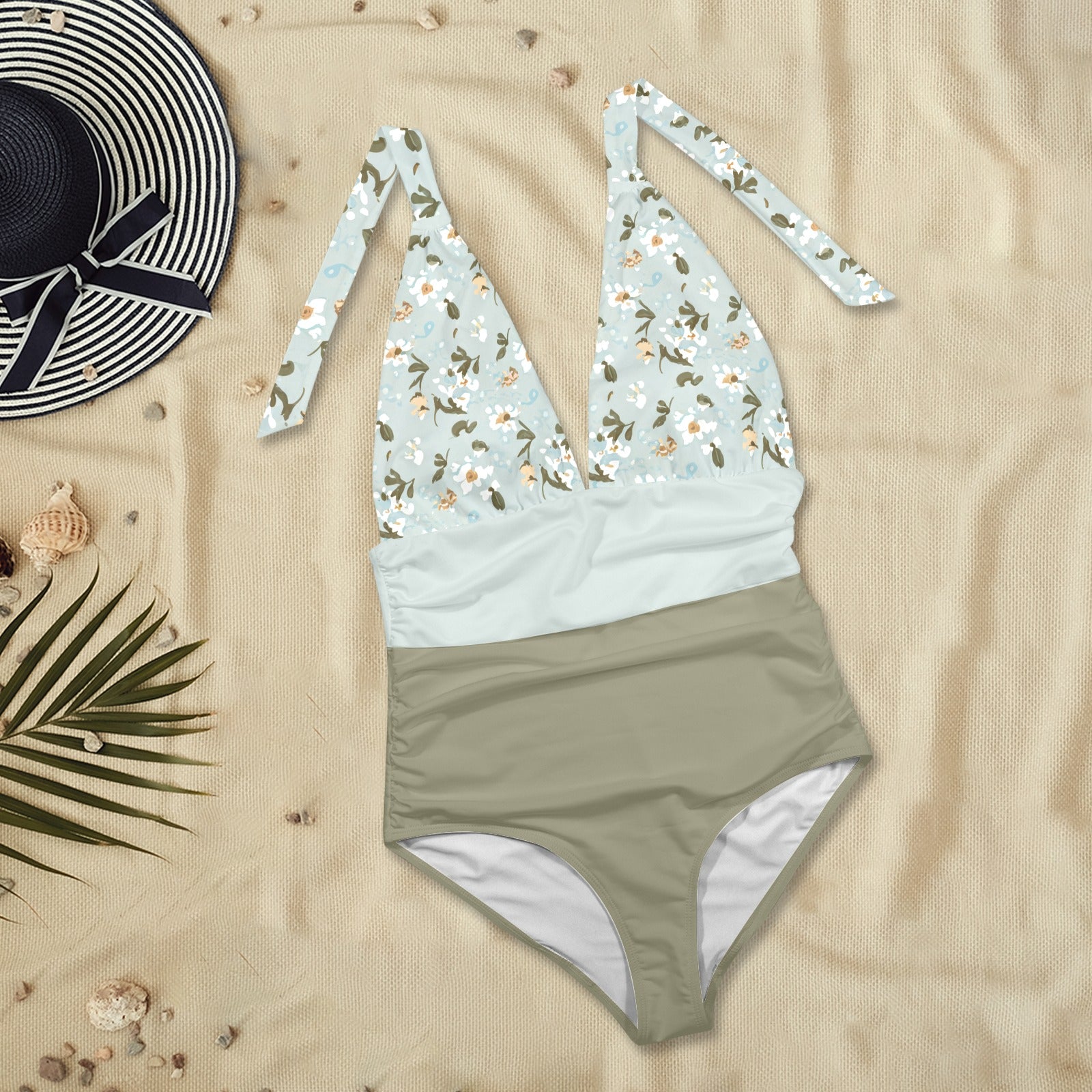 The design of this swimsuit is truly exceptional, featuring a sultry backless silhouette and adjustable halterneck straps that allow you to customise the fit to your liking. The deep V frontal cut adds an element of allure, making this swimsuit a head-turner. The gathering of the fabric on the sides drapes beautifully around the tummy, enhancing and flattering any body shape.