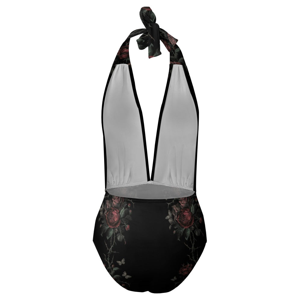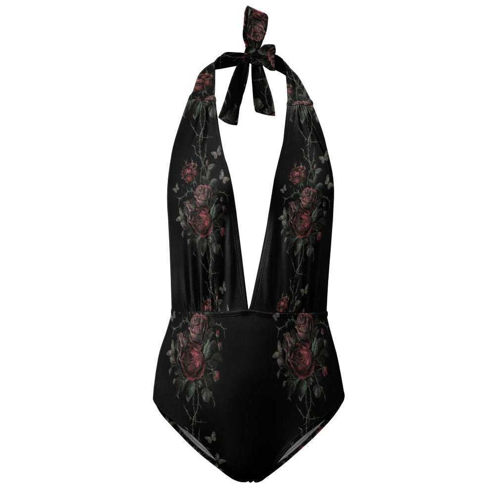 Vampire Art Retro Floral Romance Halter Plunge One-Piece Swimsuit - Goth Rose Vines
