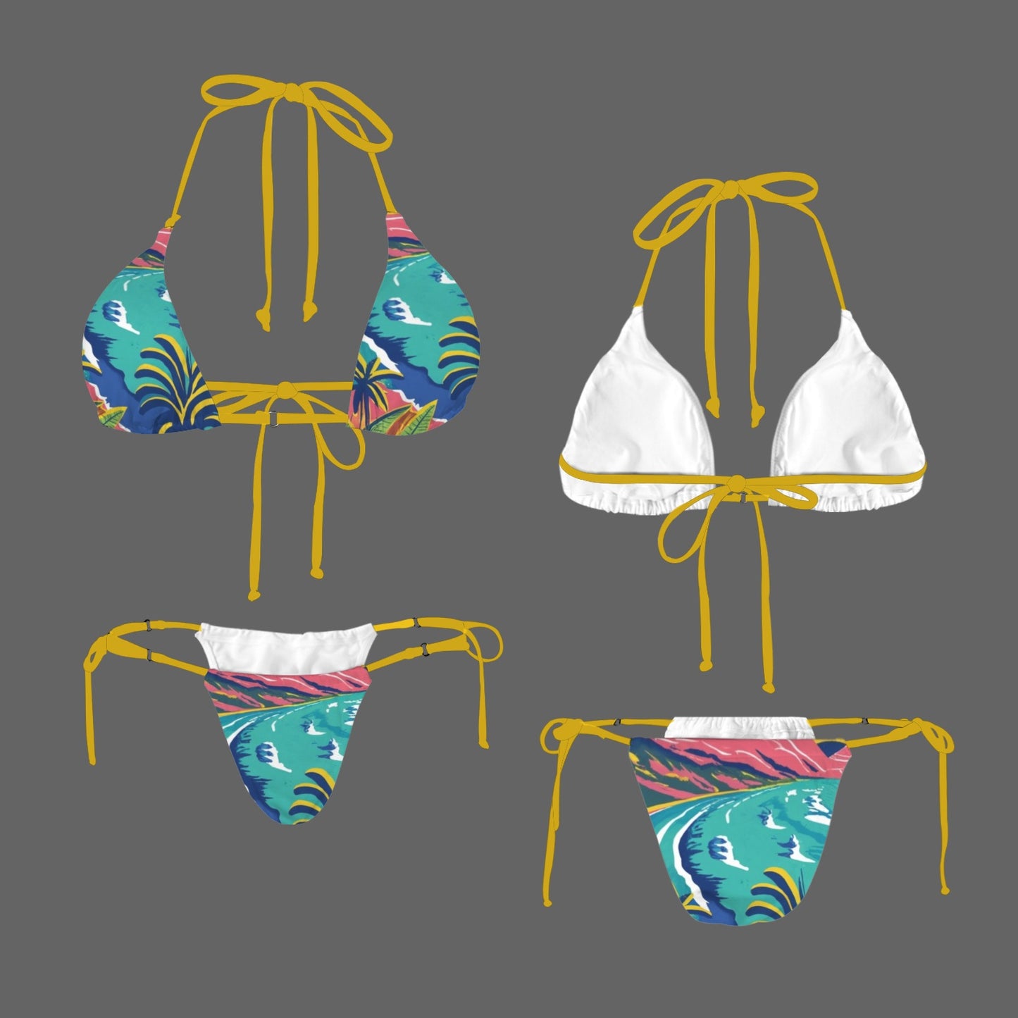 • Design: Adjustable halter and back ties, string thong bikini bottom with small ring metal accessories