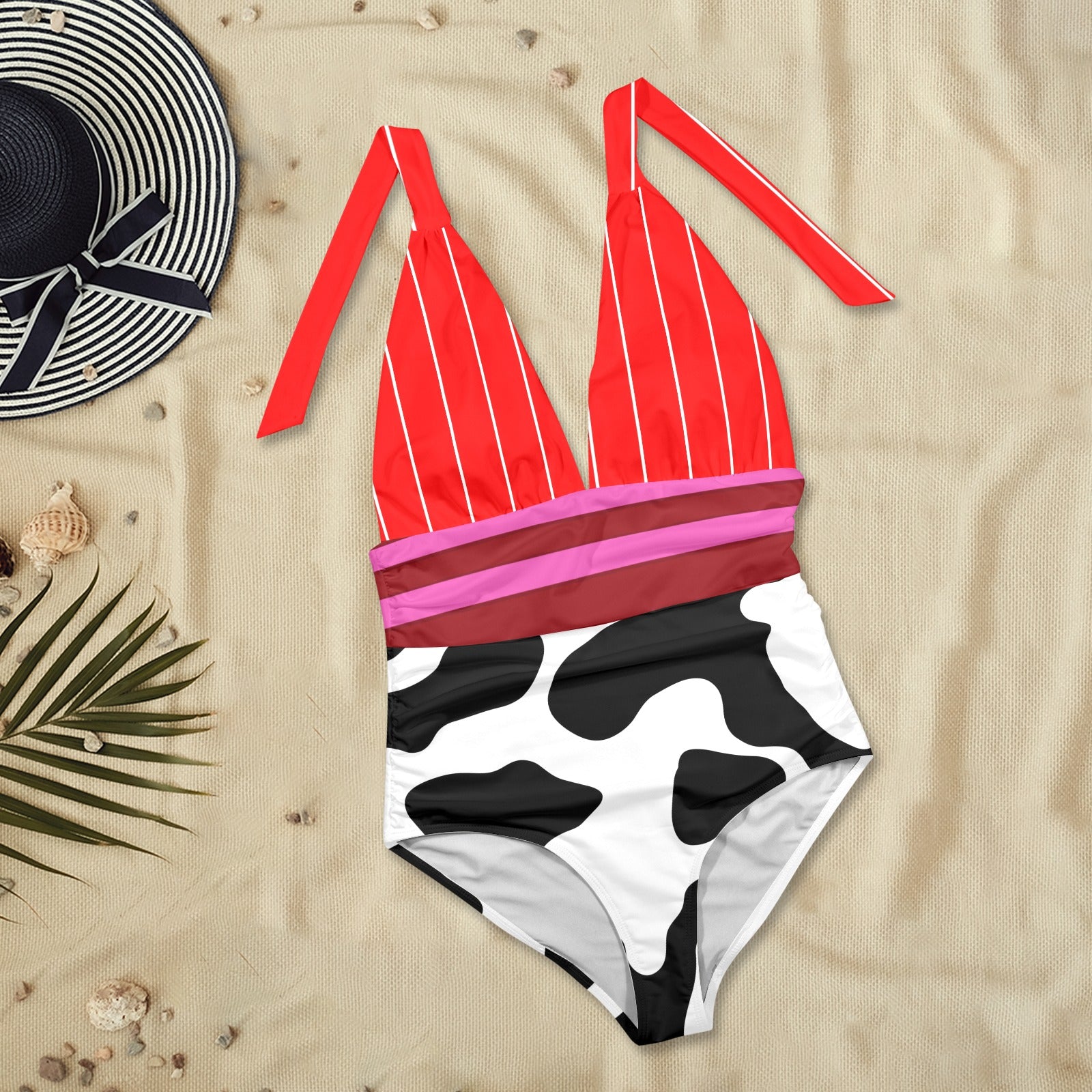 Vampire Art Glam Plunge Halter Backless Swimsuit - Contrast Red and Cowhide Patchwork
