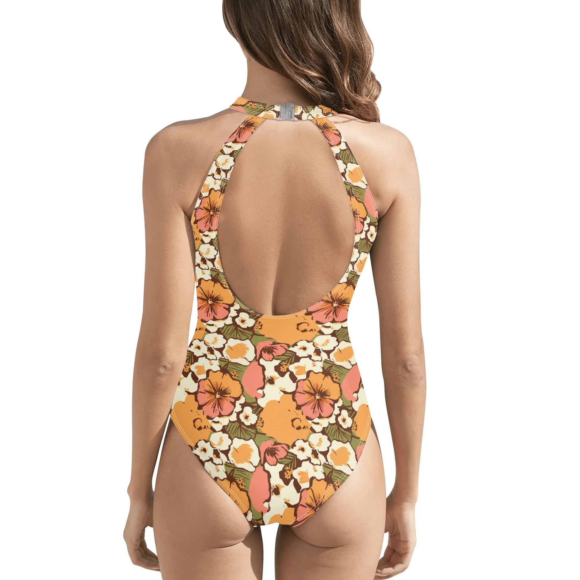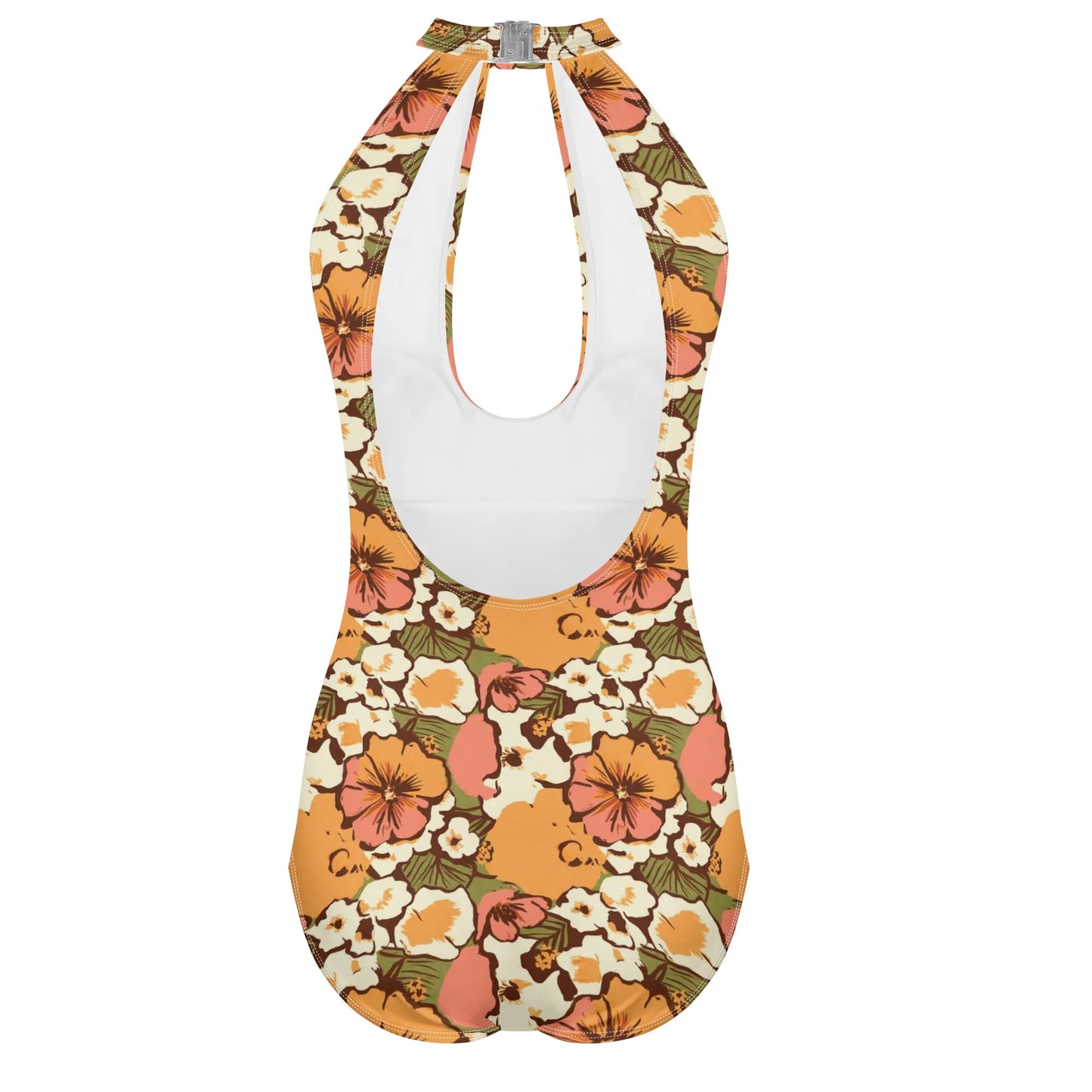Embrace the essence of the 70s with the Vampire Art Retro Bloom Halter One-Piece Swimsuit, a timeless piece that combines vintage charm with modern elegance. Featuring a stunning retro-inspired floral pattern in warm hues of orange, cream, and green, this swimsuit is the perfect blend of nostalgia and style, making it a must-have for your summer wardrobe.